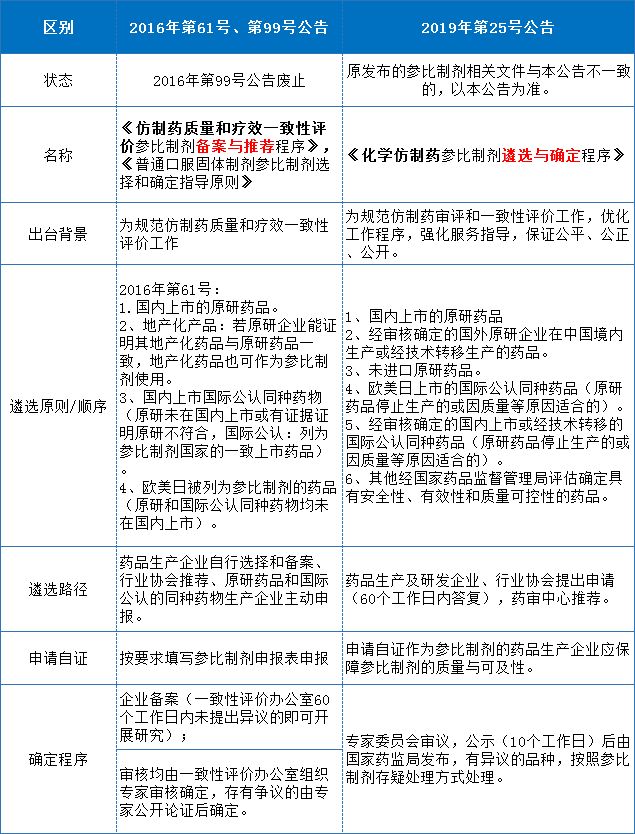 “2019年第25号公告”和之前公告内容对比主要差异体现在以下几个方面: 1、参比制剂选择顺序