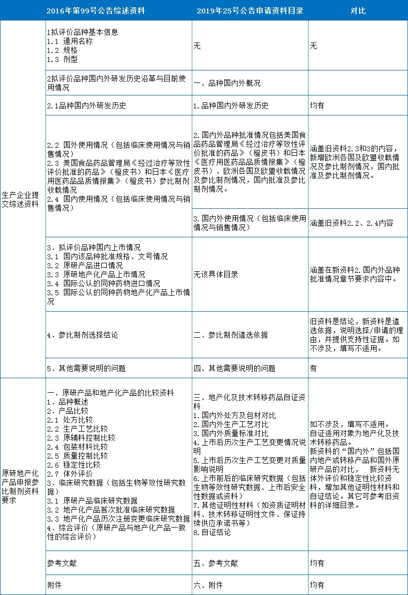“2019年第25号公告”与之前参比制剂的主要公告文件内容对比见表1: